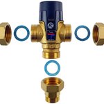 Anti-scald valve with side outlet, knob adjustable in the range 35-65°C. Kvs=1,3 m3/h, connection G 3/4" M. Ensures such mixing cold and hot water from a heater that the outgoing water is of the preset temperature. If cold water supply is interrupted, the valve closes hot water supply to avoid scalding at the outlet point. Valve have threaded fittings with check valve to prevent back flow and with strainer for protection against dirties at cold and hot water inlet to the valve. There is only threaded fitting at the mixed water outlet.