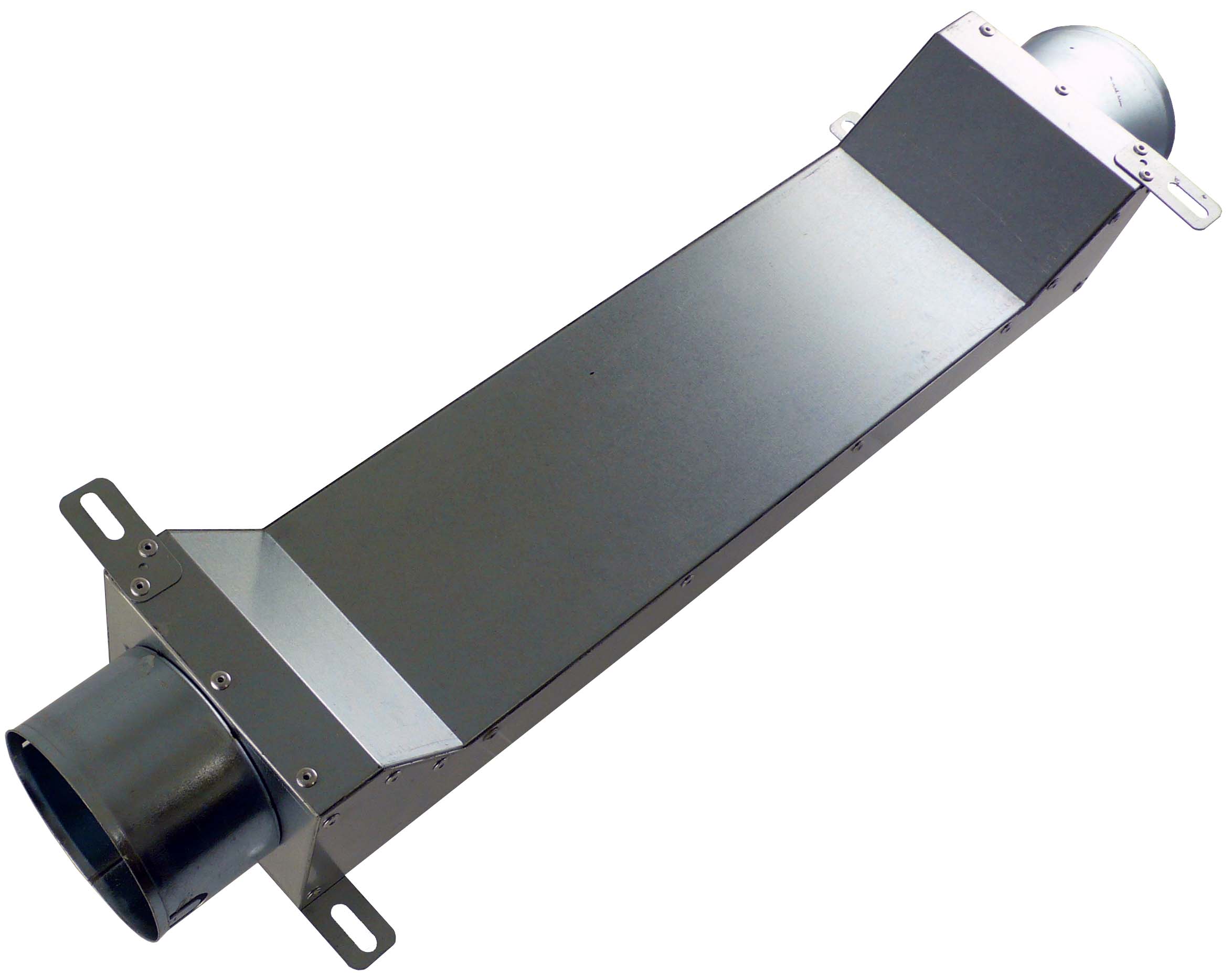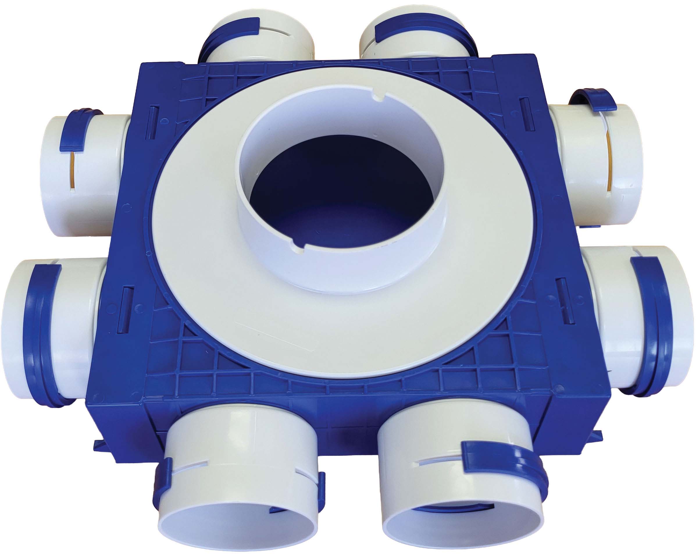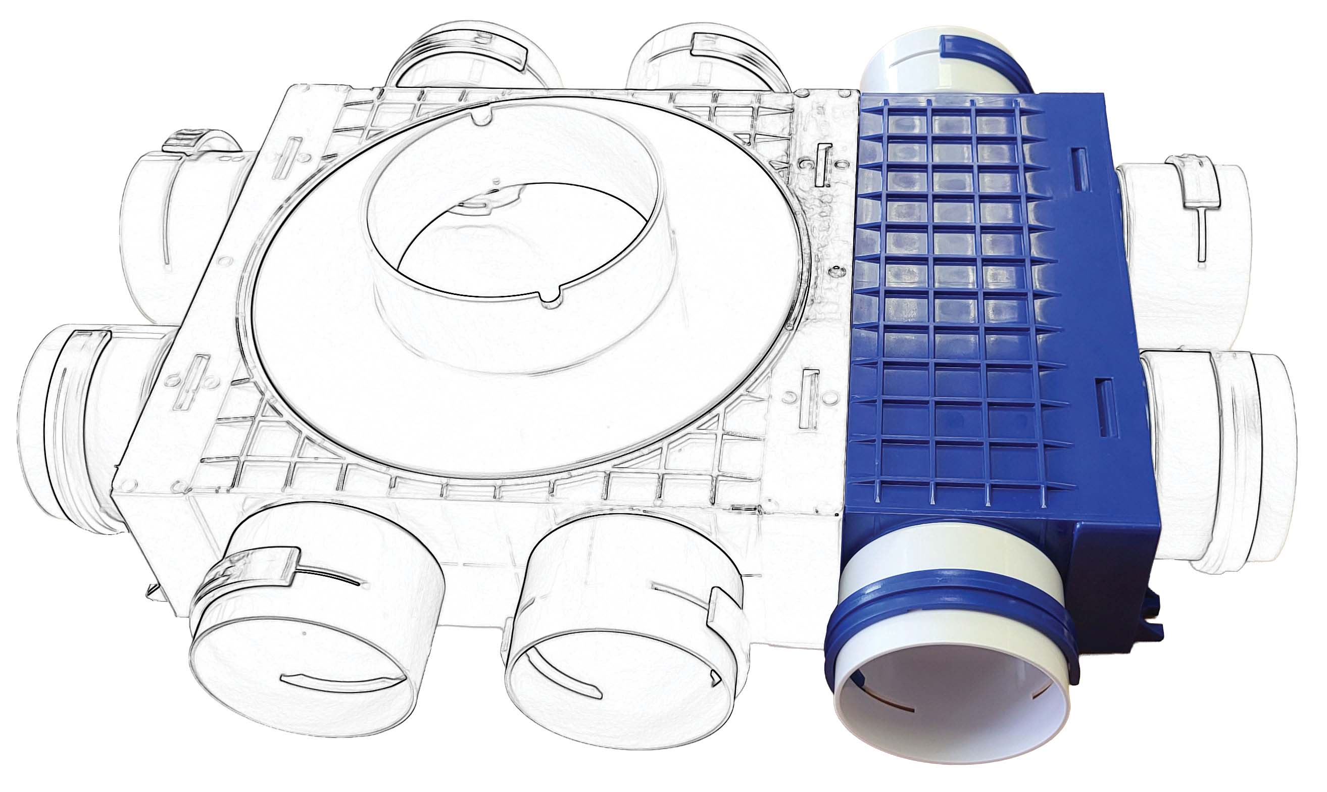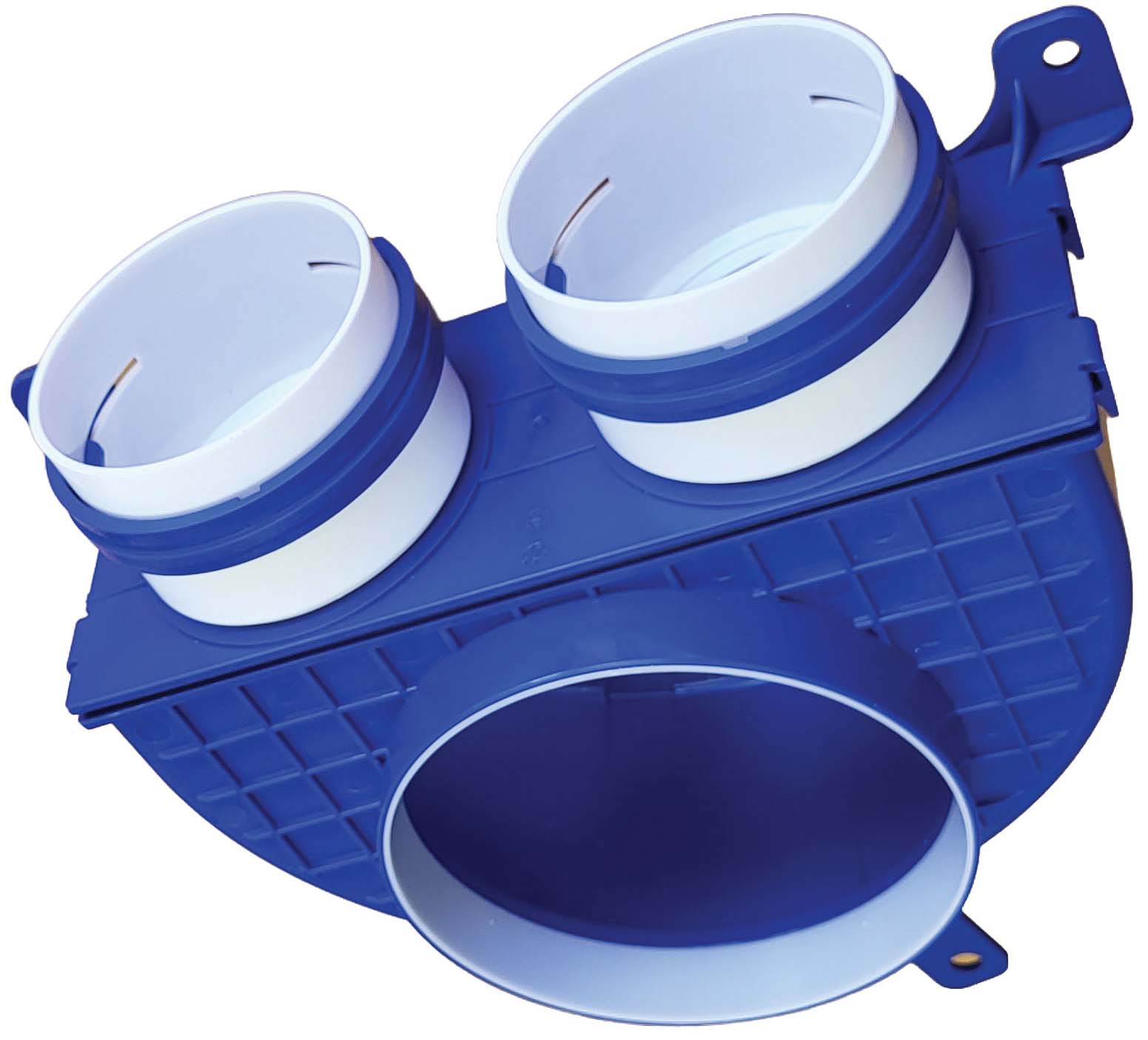 The ceiling outlet enables transition from 75mm diam. PE ducting to a 125mm disk valve. Either both inlets can be used, or one can be blanked. |