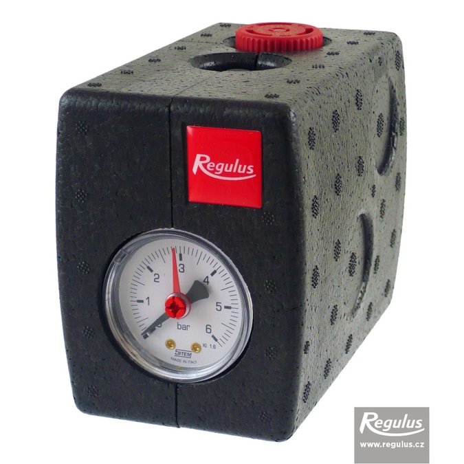 Designed for control of heating system pressure and air venting the heat source circuit (boiler, heat pump, electric heating elements, etc.). The assembly consists of a safety valve (PV), an air release valve (OV), a pressure gauge, a housing with two universal 1/2" F / 3/4" M necks w. plug, insulation.